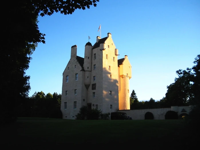 The Bissetts occupied a 12th century motte in this vicinity until they fell from power in 1242. Alexander III then used it as a hunting seat but there is no evidence it was rebuilt in stone and references to Coull during the Wars of Independence are thought to refer to Coull 3km to the NW. Aboyne was later held by the Knights Templars, the Frasers, and the Keiths, and in 1449 passed by marriage to the 1st Earl of Huntly, being subsequently used by younger sons of the chiefs. Now restored and with late 18th Century and late 19th century additions stripped away, the tall building close to the Dee north of the billage comprises a main block of four stories and an attic with a square wing with balustrade top at the NE corner and a round turret with a square caphouse at the NW corner. It probably mostly dates from c1600 but on the lintel of the entrance in the wing is the date 1671 and the initials of Charles Gordon and Elizabeth Lyon. Charles was the fourth son of the 2nd Marquess of Huntly and had recently been created Earl of Aboyne as belated thanks for helping to persuade General Monck to support the Restoration of Charles II in 1660. In 1836 George, 5th Earl of Aboyne, succeeded as Marquess after the death of the 5th Duke of Gordon. It was held by Sir William Cunliffe Brooks in the late 19th Century but now forms again a seat for the Earl of Aboyne, son of the Marquis of Huntly