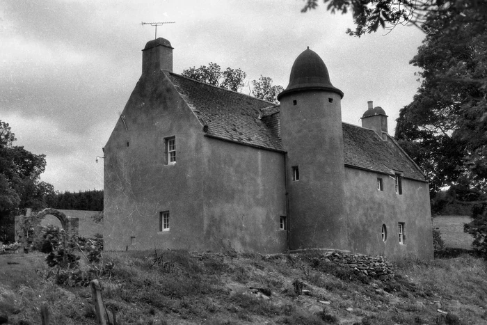According to Tranter, the building has been much altered, the roof-line having been lowered – except on the round stair-tower, which now looks too tall. The ogee roof on the top of the round tower is not original.